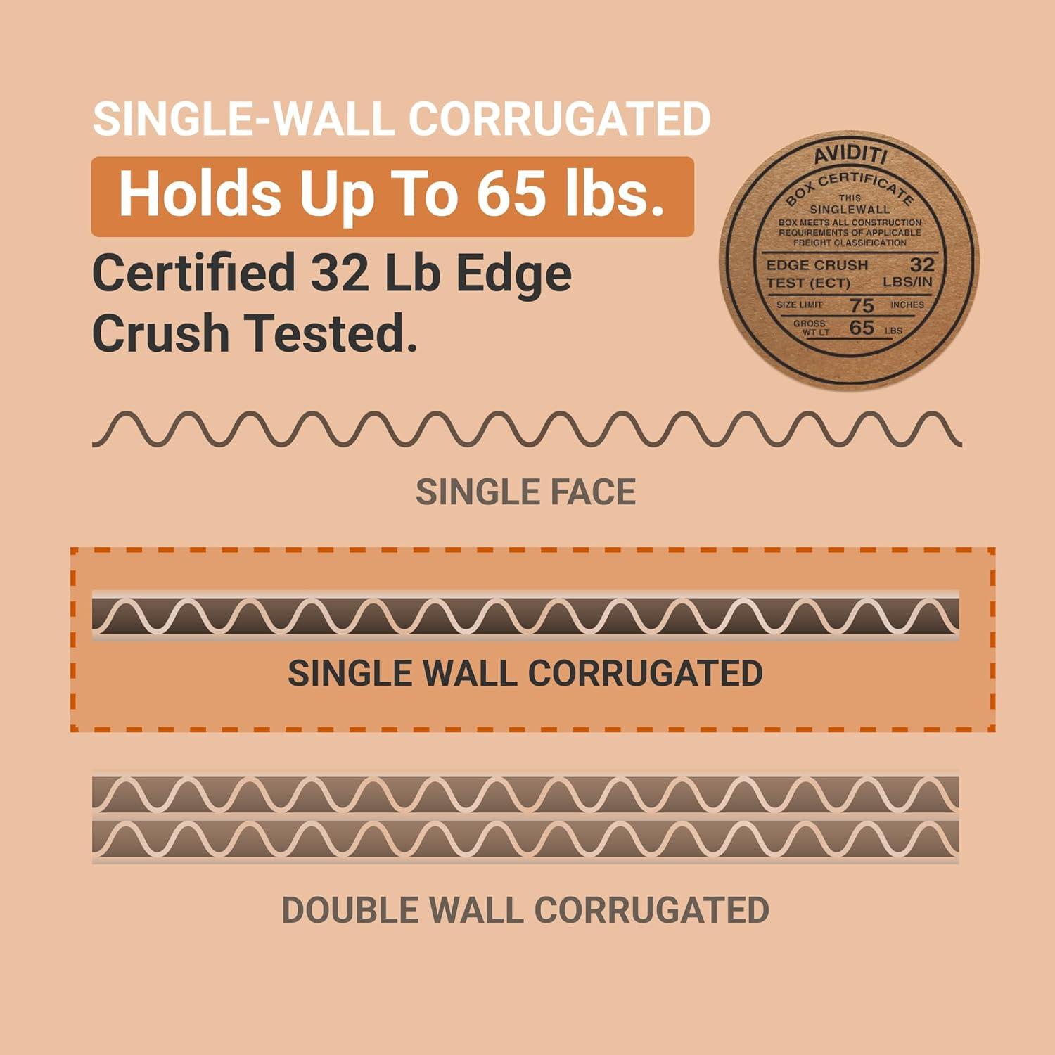 Heavy Duty Shipping Boxes: Holds up to 65 lbs (pounds), 32 lb (pound) edge crush tested, certified and tested to meet all single wall box storage, mailing, and freight requirements