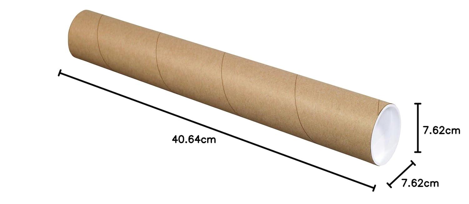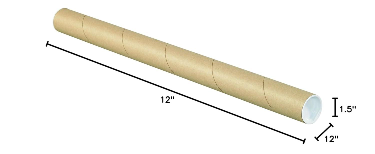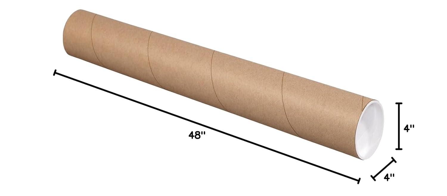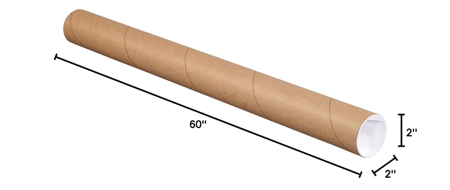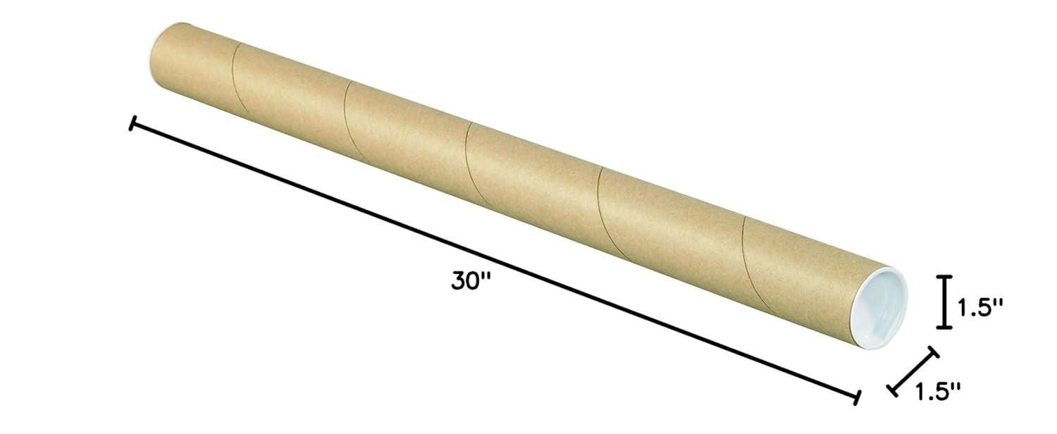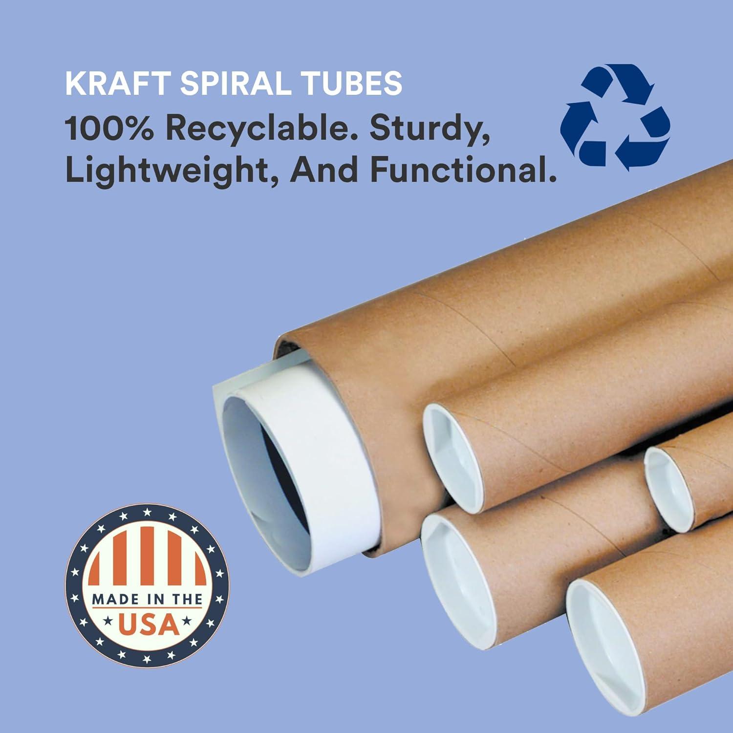3″ x 36″ Kraft mailing tubes with caps. Economical Kraft mailing tubes are great for document storage or for mailing. 3-Ply spiral wound construction for strength. White end caps (included) snap into place to hold contents secure. Caps will not pop off during shipment. Tubes are reusable and recyclable. Sizes listed are usable space. Actual tube lengths are longer.