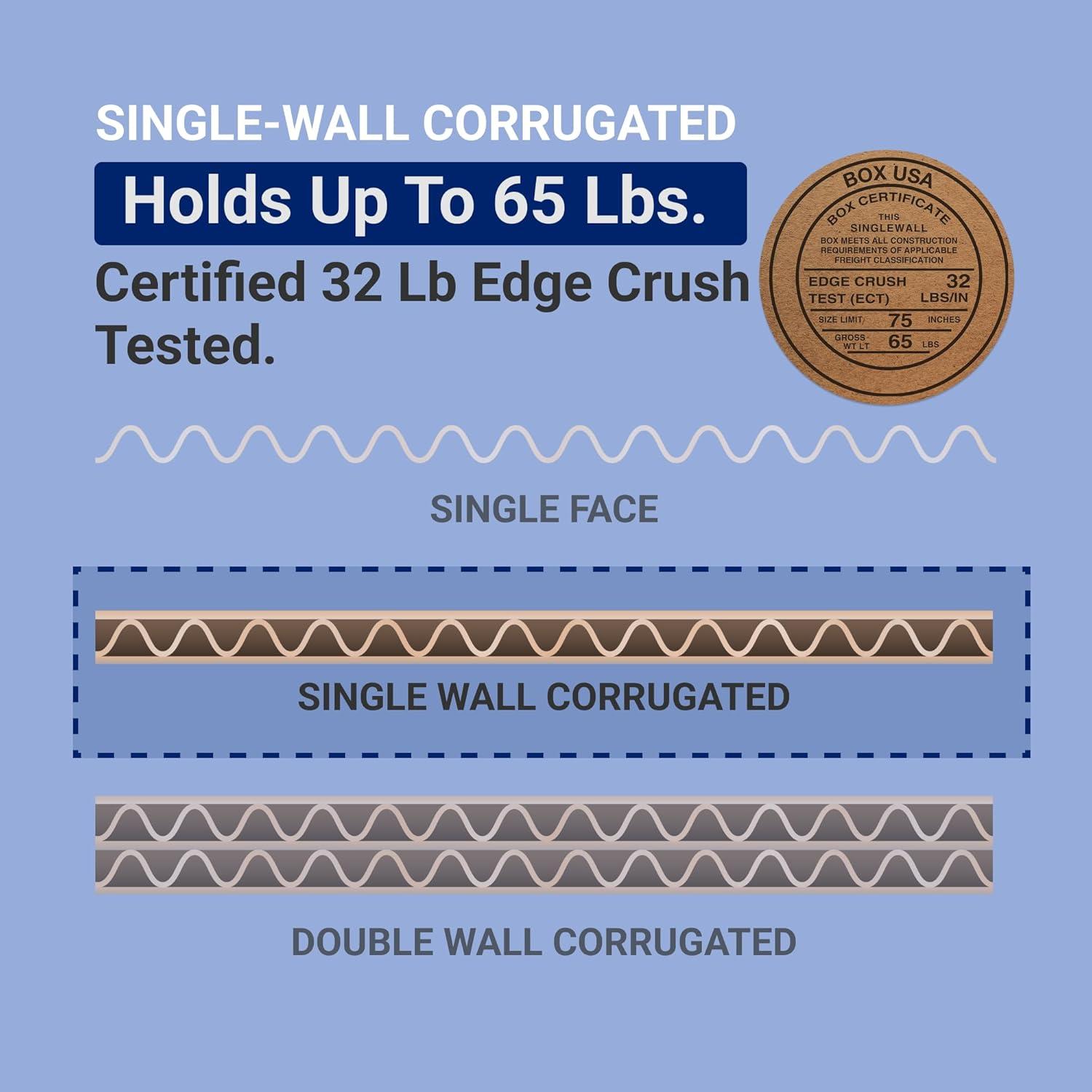 Heavy Duty Shipping Boxes: Holds up to 65 lbs (pounds), 32 lb (pound) edge crush tested, certified and tested to meet all single wall box storage, mailing, and freight requirements
